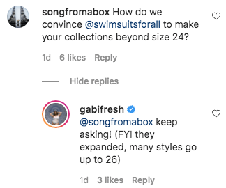 Now, it’s worth noting that Gabi’s line stops at a 26, but that her sizing chart indicates they run small. She noted in the comments section of a separate post that most people size up. So, a 26 runs closer to a 24, and a 24 runs closer to a 22, and so on. A plus-size influencer who is known for calling out brands for not being size-inclusive enough on Twitter has a swimsuit line and put the onus back on her fat customers who cannot buy her products to “keep asking” the company for larger sizes. HOW ABOUT YOU ASK, Gabi. How about you use your clout and relationship with the company in question to encourage them to expand their sizes. No? Okay then.